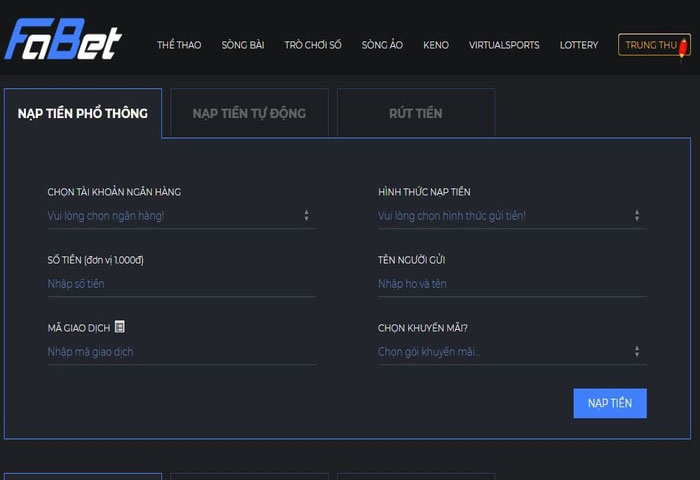 Chắc hẳn nạp tiền Fabet là thắc mắc của nhiều anh em hiện nay khi lần đầu tiên thực hiện giao dịch tại nhà cái. Để giúp mọi người dễ dàng thao tác, tôi sẽ hướng dẫn nhanh các bước dưới đây.